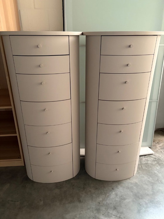 Questo set di due cassettiere di design italiano emana eleganza e raffinatezza. Con la loro forma cilindrica e sottile e la finitura grigio-crema, si adattano perfettamente agli interni moderni. Queste cassettiere sono in condizioni eccellenti, con solo minimi segni d'uso appena visibili. Un'aggiunta meravigliosa per qualsiasi stanza che voglia combinare stile e funzionalità.