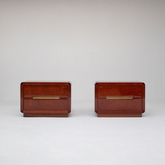 Questi comodini italiani esaltano l'eleganza del design italiano di metà secolo. Presentano una calda impiallacciatura in radica con venature vivaci e naturali. La superficie presenta tonalità intense e sottili variazioni. I bordi delicatamente arrotondati conferiscono ai pezzi un aspetto calmo ed equilibrato. Ogni comodino ha un cassetto con maniglia in ottone integrata. La maniglia aggiunge un raffinato contrasto al legno. Le dimensioni compatte rendono questi comodini in radica italiana facili da posizionare. Si adattano perfettamente a camere da letto, camere per gli ospiti o interni boutique. Realizzati in Italia, la lavorazione artigianale trasmette precisione e attenzione. I cassetti scorrono fluidamente e offrono un pratico spazio di archiviazione. Lievi segni del tempo sono visibili sulla superficie. Questi segni sono coerenti con l'uso vintage e aggiungono carattere. Questa coppia di comodini in radica italiana dona calore e consistenza. Si adattano facilmente sia ad interni classici che moderni.