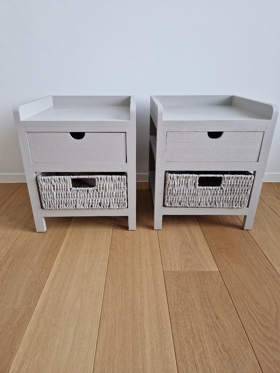 Due comodini laccati grigio chiaro. Piano 35x35 cm, altezza 42 cm. Due cassetti; se lo si desidera, è possibile utilizzare un cestello inferiore con contenitore.