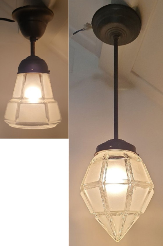 Due lampade a sospensione Art Déco degli anni '40 (l'anno esatto non mi è noto). Entrambe le lampade presentano un paralume in vetro dalle linee pulite; le linee sono in vetro trasparente, mentre i blocchi sono in vetro satinato. Le parti metalliche sono in ottone o bronzo. Entrambe le lampade sono in buone condizioni, con i normali segni del tempo, come alcune macchie e graffi sul metallo. La lampada più grande presenta una piccola imperfezione lungo il bordo; ho applicato della colla bicomponente per rinforzarla (vedi le ultime due foto). Questa parte danneggiata non compromette la solidità della sospensione ed è completamente nascosta dietro il rosone a soffitto. La lampada più piccola misura 24 cm di lunghezza e 12 cm di diametro. La lampada più grande misura 52 cm di lunghezza e 15 cm di diametro.