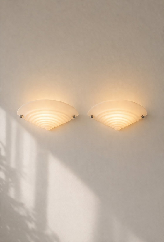 Bellissimo set di applique di design francese in vetro bianco opaco con la caratteristica decorazione a rilievo stratificato. Un modello senza tempo che si adatta perfettamente sia ad interni moderni che vintage.
