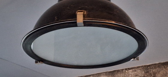 La lampada industriale ha un aspetto robusto con una finitura in metallo nero e un paralume in vetro che diffonde delicatamente la luce.