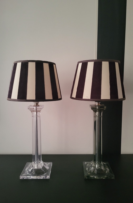 Due bellissime lampade da tavolo per una cassettiera o accanto al letto. Base in plexiglas con paralume nero/écru. Nota: una base in plexiglas è trasparente, l'altra ha una finitura in vetro fumé; vedere le foto per riferimento. I modelli sono identici. Dimensioni: 44 (A) x 19 (P) cm. Materiale: plexiglas (base e base), metallo e tessuto (paralume). Colore: base in vetro fumé trasparente con paralume a righe nero/écru.
