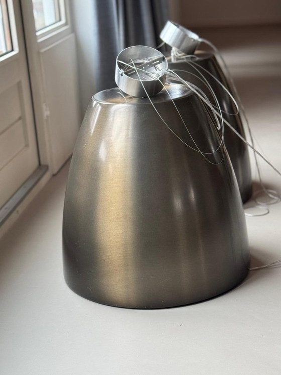 - 2 lampade a sospensione Presso ispirate alle capsule Nespresso. Marchio Hala. Materiale: alluminio marrone/rame, diametro 48,5 cm e altezza 45 cm.