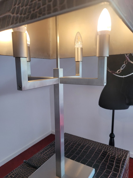 Questo set di due lampade da tavolo originali di Philipp Plein è una splendida aggiunta a qualsiasi interno. Le lampade sono rifinite in pelle di coccodrillo marrone con una stampa in rilievo che conferisce un aspetto lussuoso. L'interno è rivestito d'oro, per un'illuminazione calda e suggestiva. Il design moderno rende queste lampade una scelta elegante sia per gli spazi classici che per quelli contemporanei.