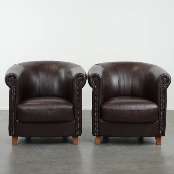 Questo set di poltrone in pelle di mucca in stile inglese presenta una splendida e insolita combinazione di colori marrone/viola scuro. Le poltrone sono rifinite con borchie e cuciture decorative, che conferiscono loro un aspetto classico, elegante e senza tempo. Possono essere facilmente inserite in qualsiasi ambiente. Sono perfette non solo in un ambiente domestico, ma anche in un negozio, un ufficio o un ristorante. Presentano lievi segni di usura. Strutturalmente, sono in buone condizioni e pronte per l'uso immediato. Saranno un'aggiunta gradita alla vostra casa.