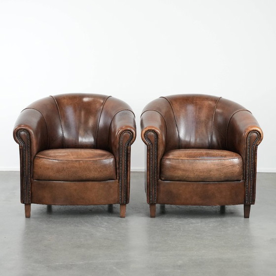 Un set elegante che si adatta perfettamente sia agli interni classici che a quelli moderni dello spazio che avete scelto. Questo elegante set di due poltrone è realizzato in pelle di pecora e presenta un design senza tempo con splendide forme arrotondate. Sono rifinite con borchie decorative, che contribuiscono a un look senza tempo ma lussuoso. Le poltrone sono dotate di cuscini fissi e offrono una seduta comoda e confortevole. Anni di utilizzo responsabile hanno mostrato alcuni segni di usura. Strutturalmente, sono in buone condizioni e pronte all'uso e, con la dovuta cura, questo set vi offrirà anni di seduta e piacere visivo!