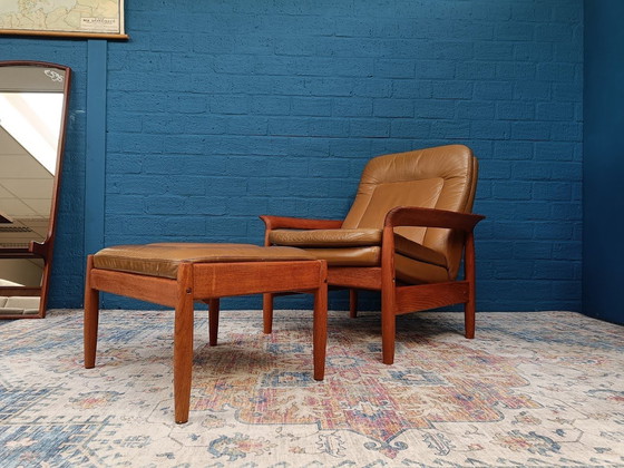 Due splendide poltrone vintage con un poggiapiedi originale. Queste poltrone sono attribuite a Bramin, un produttore di mobili danese. Le poltrone sono state prodotte negli anni '60. La solida struttura in teak è splendidamente sagomata con braccioli curvi. Il rivestimento in pelle marrone è originale e quindi presenta una patina. Una sedia presenta alcune cuciture allentate. Anche il poggiapiedi è in buone condizioni con lievi segni di usura. Le strutture sono state completamente levigate e oliate. La pelle è stata trattata con cera d'api biologica per pelli. Il prezzo indicato si riferisce a due poltrone e un poggiapiedi. Dimensioni della poltrona: Larghezza: 78 cm. Profondità: 80 cm. Altezza: 83 cm. Altezza seduta: 38-41 cm. Dimensioni del poggiapiedi: Larghezza: 58 cm. Profondità: 48 cm. Altezza: 36 cm.