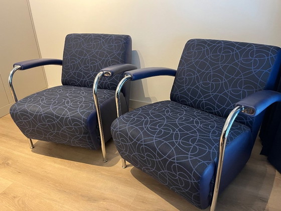 Prova il massimo comfort con questo set di due poltrone Leolux Scylla. Queste sedie combinano un design moderno con un look senza tempo, perfette per qualsiasi soggiorno o ufficio. Il rivestimento blu intenso, una combinazione di pelle e tessuto, con un'elegante fantasia aggiunge un tocco di raffinatezza ai tuoi interni. I braccioli cromati, rivestiti in pelle, e le gambe garantiscono una struttura robusta e durevole, mentre il design ergonomico garantisce un comfort di seduta ottimale. Scopri il perfetto equilibrio tra stile e funzionalità con queste splendide poltrone Leolux.