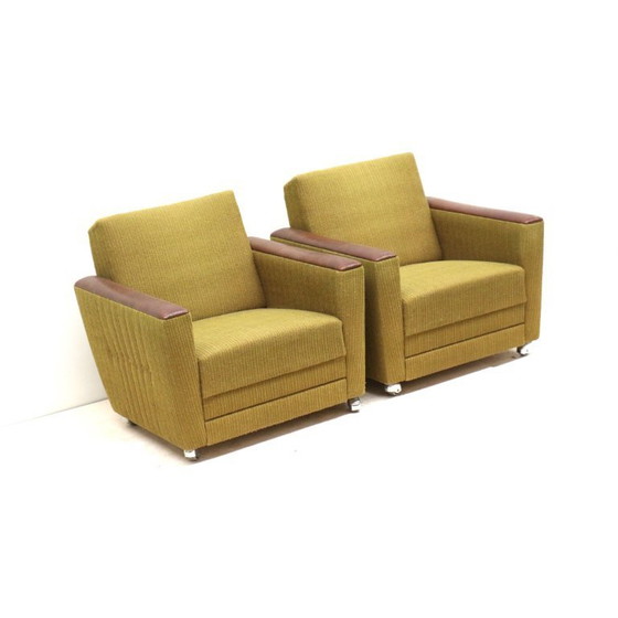 Set di 2 comode poltrone vintage degli anni '50-'60, caratterizzate da un rivestimento caldo e da eleganti braccioli con inserti in pelle. La forma slanciata e la seduta ampia conferiscono alle poltrone un autentico look mid-century che aggiunge immediatamente atmosfera a qualsiasi ambiente.