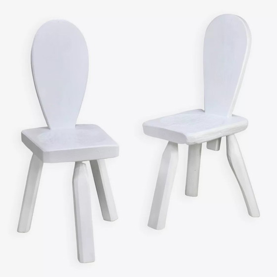 **Dimensioni:** A97 x L37 x P50 **Colore:** Bianco **Materiali:** Legno (materiale) **Stile:** Design Coppia di sedie a treppiede, sedute scavate. Brutalista, circa 1960. Legno verniciato. Tracce e gocce di vernice che sembrano recenti. Pesanti, solide e stabili. Design brutalista.