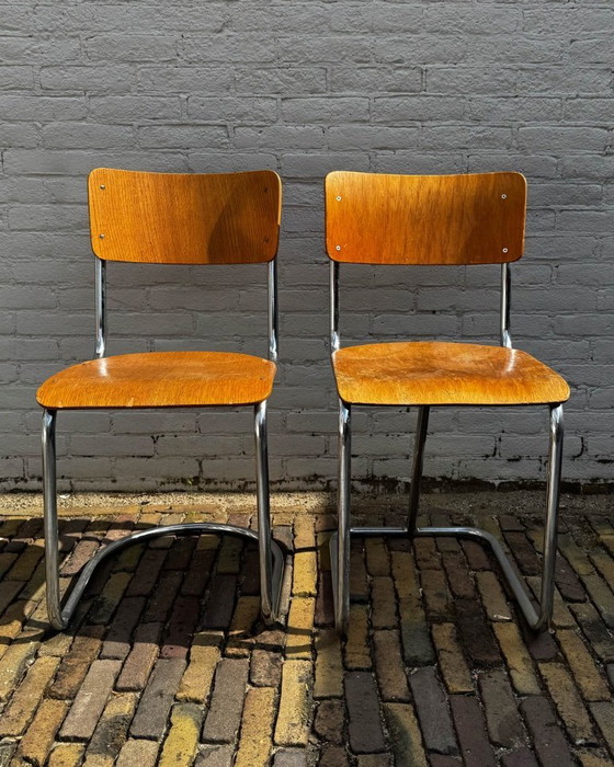 Questo set di due sedie vintage in tubolare d'acciaio aggiunge un tocco di fascino retrò ai vostri interni. Le sedie combinano un design Bauhaus senza tempo con l'eleganza del legno e del metallo, rendendole un'aggiunta versatile a qualsiasi ambiente.
