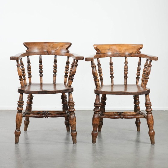 Queste splendide sedie da capitano antiche inglesi hanno acquisito una meravigliosa patina nel corso degli anni. Risalenti ai primi anni del 1800, queste sedie presentano colori caldi e raffinati, schienali a fuso e sedute dalla forma elegante. Non sono solo funzionali, ma aggiungono anche un tocco di eleganza e raffinatezza a qualsiasi interno.