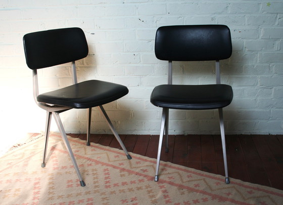 Due sedie Result disegnate da Friso Kramer e Wim Rietveld nel 1958 e prodotte da Arhrend de Cirkel. Le sedie sono in condizioni completamente originali, con segni di usura coerenti con la loro età. Entrambe le sedie recano l'etichetta Ahrend de Cirkel (una sedia ha un'etichetta integra, l'altra è in gran parte strappata, ma i bordi sono inconfondibili). La seduta e lo schienale sono realizzati in similpelle e una sedia mostra tracce di una precedente, ma molto accurata, riparazione della seduta. Questo progetto è senza dubbio una pietra miliare nella storia del design, in termini di materiali e costruzione. Le sedie sono state ritrovate in soffitta durante lo sgombero di un ex studio notarile, dove probabilmente sono rimaste per anni.