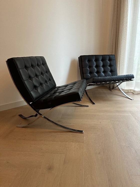 Queste sedie Barcelona originali (modello MR90), progettate da Ludwig Mies van der Rohe, sono le prime edizioni degli anni '60-'70. Il design iconico fu originariamente creato nel 1929 per il Padiglione Tedesco all'Esposizione Universale di Barcellona. Knoll iniziò ad aggiungere il marchio alla struttura e ai cuscini negli anni '90; queste sedie sono antecedenti a quel periodo e pertanto non recano il logo Knoll.