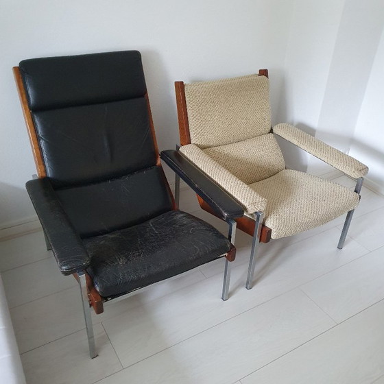 Due sedie vintage Rob Parrey, una rivestita in pelle e l'altra in tessuto. Queste sedie combinano comfort e un look senza tempo. Perfette per gli amanti del design retrò. La seduta in pelle nera è danneggiata nella parte inferiore, ma può essere facilmente riparata. Non ci sono strappi o buchi nella pelle. Vedi foto.