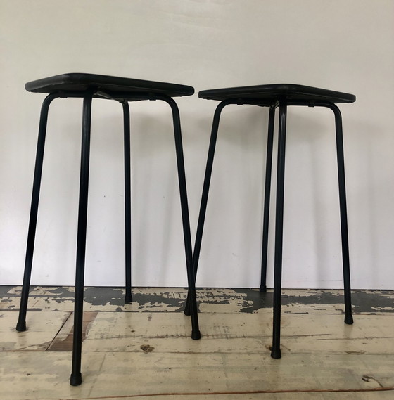 Set di due sgabelli vintage in metallo nero con seduta in similpelle. Questi sgabelli hanno un aspetto classico e sono perfetti per interni retrò o industriali. La struttura in metallo garantisce stabilità, mentre la seduta in similpelle offre comfort. Ideali per l'uso in cucina, al bar o come seduta aggiuntiva in soggiorno.