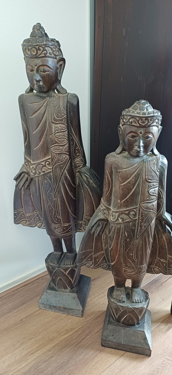 Queste splendide statue in legno sono un vero e proprio complemento d'arredo per qualsiasi interno. Con un'altezza rispettivamente di 100 cm e 90 cm, emanano un fascino autentico. Le raffinate incisioni testimoniano la maestria artigianale e conferiscono alle statue un aspetto unico. Perfette per gli amanti dell'arte tribale e dei materiali naturali. Aggiungete un tocco di cultura e storia al vostro spazio con questi pezzi speciali.