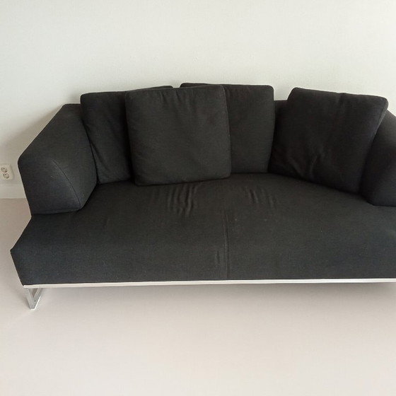 Il divano a 2,5 posti di B&B Italia è realizzato in tessuto color antracite con base in acciaio inox e quattro cuscini schienale sfoderabili. Sebbene usato (qualche piccola macchia e un buco appena visibile, riparato), l'interno è ancora in buone condizioni. (Larghezza seduta 130 cm, profondità seduta 70 cm, 60 cm incluso il cuscino)