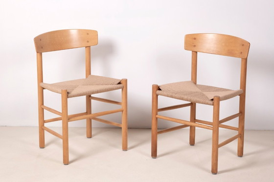 Due sedie da pranzo Børge Mogensen, modello J39 in faggio, prodotte da FDB Møbler nel 1970. Le sedie sono dotate di nuovi sedili in papercord che le faranno durare ancora per molti anni. Uno dei più noti classici del design danese.