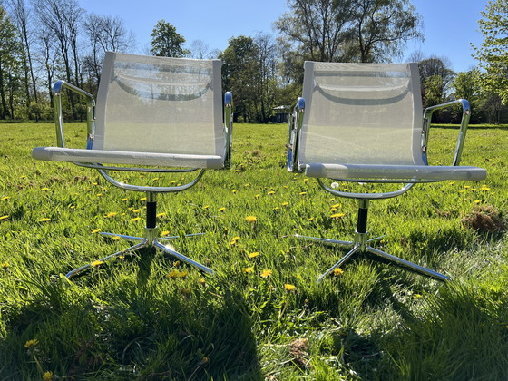 Arredate i vostri spazi con queste due moderne sedie EA107 in un fresco tessuto a rete bianco. Perfette per un look contemporaneo in ufficio o in soggiorno. Le sedie non sono solo eleganti, ma anche comode e funzionali, grazie alla base girevole e alla robusta struttura in metallo. Il tessuto a rete traspirante crea un aspetto leggero e arioso, ideale per qualsiasi interno moderno. Non perdete l'occasione di aggiungere un tocco di design ai vostri interni!