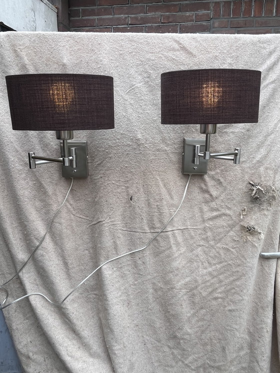 Queste lampade da parete alla moda della serie Heron Armada di Highlight presentano un design elegante e moderno con una combinazione di metallo e tessuto. Le lampade hanno un elegante paralume marrone e un braccio girevole in metallo color argento, che le rende un'aggiunta perfetta a qualsiasi spazio moderno. Ideali per un'illuminazione d'atmosfera in soggiorno o camera da letto. In eccellenti condizioni vintage con prevedibili segni di usura.