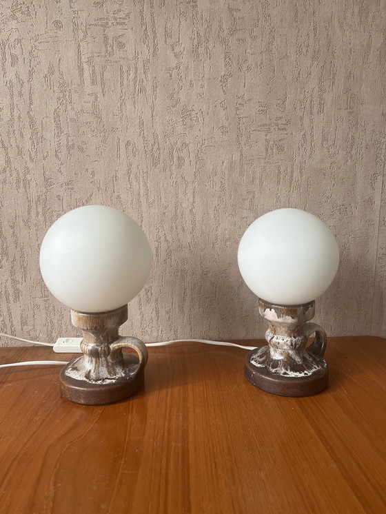 Questa coppia di lampade da tavolo vintage "fat lava" presenta una caratteristica base in ceramica con uno smalto strutturato simile alla lava nei toni del marrone e del bianco. I paralumi in vetro sferico forniscono una luce soffusa, perfetta per creare un'atmosfera accogliente. Queste lampade sono un'affascinante aggiunta a qualsiasi arredamento vintage o di ispirazione retrò, che mette in mostra lo stile unico del design della metà del XX secolo.