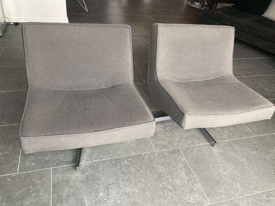 Bellissime poltrone di design del famoso marchio olandese Harvink, disegnate da Martin Haksteen. Poltrone girevoli con rivestimento in tessuto color tortora.