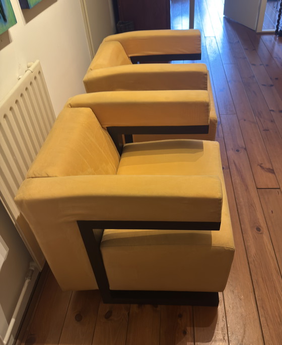 Due poltrone F51, originariamente progettate nel 1920 dal designer/direttore del Bauhaus Walter Gropius. Repliche degli anni '80 con rivestimento in Alcantara giallo scuro, pulite professionalmente. Prezzo unitario.