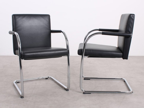 La Visasoft usata, disegnata da Antonio Citterio e Glen Oliver Löw per Vitra, emana tranquillità ed equilibrio grazie alla combinazione di una splendida pelle nera e di un'elegante struttura a slitta in metallo. I braccioli integrati offrono un comfort naturale, mentre la struttura tubolare in acciaio si flette delicatamente per una seduta rilassata. Questo rende la Visasoft leggera e confortevole anche durante lunghe sessioni di seduta.