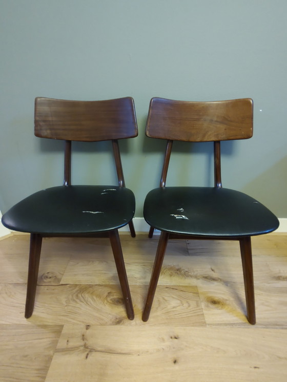 Questo set di due sedie da pranzo di Louis van Teeffelen per Topform è un bellissimo esempio di design Mid-Century Modern. Le sedie hanno un'elegante struttura in legno con una comoda seduta in similpelle. La seduta è rovinata. Perfette per gli amanti dei mobili vintage che desiderano aggiungere un tocco autentico ai propri interni.