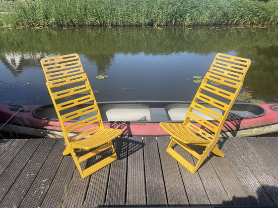 Due sedie da giardino Maratea usate ma in buone condizioni. Le sedie hanno qualche perdita di colore qua e là (soprattutto il poggiatesta pieghevole) e hanno sicuramente bisogno di essere pulite una volta. Inoltre, presentano alcuni segni d'uso qua e là.
