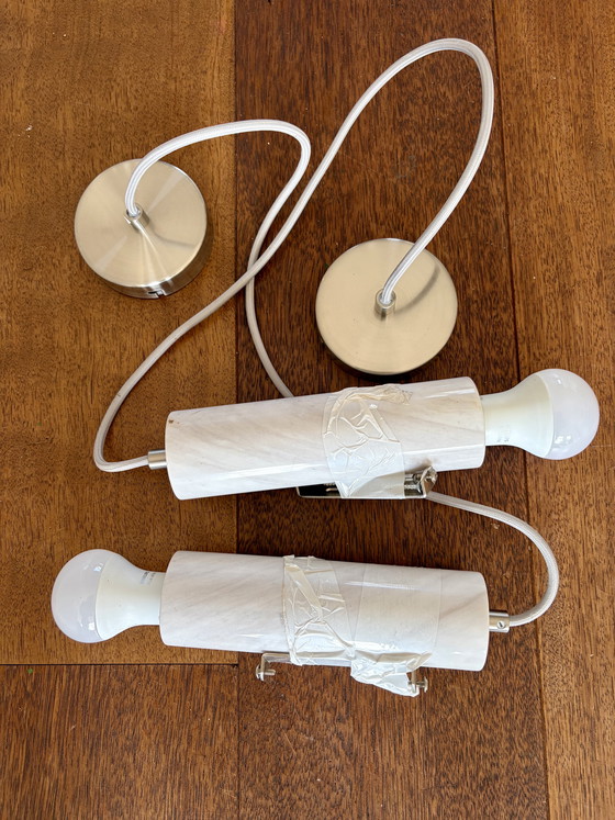 Eleganti lampade a sospensione della serie Athens di It’s about RoMi, con base in marmo massiccio. Design minimalista e senza tempo, perfetto sopra un tavolo da pranzo, un'isola cucina o in un corridoio. Entrambe le lampade sono in buone condizioni e perfettamente funzionanti. Vendute in coppia. Dimensioni: 20 cm di lunghezza x 6 cm di diametro. Lampadine non incluse. Prezzo originale: € 206,40.