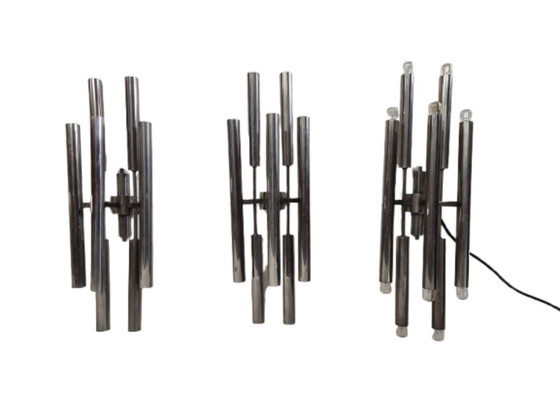 3 grandi appliques in ottone nichelato.10 luci per appliques, vendute senza lampadine.Altezza senza lampadine 55cm.Italia circa 1950/60.Stilnovo, arteluce...designer da identificare.
