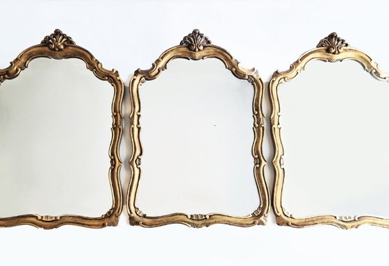 Tre specchi vintage identici provenienti da Firenze, realizzati da Ars Florentia (Piazza S. Felice 1R, Firenze). Realizzati a mano in legno con pittura in stile fiorentino color oro, non in plastica o gesso. Si ritiene che gli specchi risalgano agli anni '60/'70 e siano integri. Ogni specchio è dotato di un robusto filo di sospensione. Presentano una forma barocca delicatamente curva con decorazioni rocaille, simili allo stile di Chelini Firenze. Ideali come set o singolarmente sopra una consolle, un camino o in un corridoio. Dimensioni: Altezza 94 cm | Larghezza 63 cm Nota: le immagini degli interni sono generate dall'intelligenza artificiale e hanno solo scopo illustrativo. Non vi è alcuna garanzia di una rappresentazione esatta o di dimensioni precise. Venduto da una collezione privata. Vendita privata - nessuna garanzia, garanzia o reso.