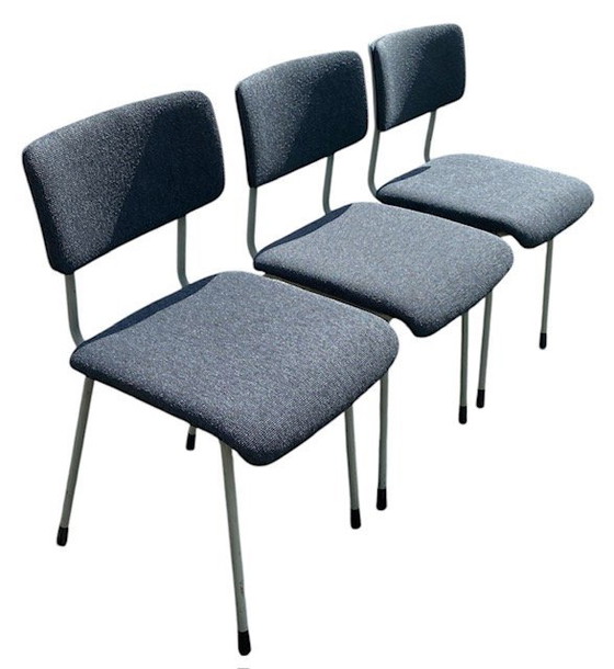 Un set di tre sedie Gispen 1231 originali. Provenienti dall'Università Tecnica di Delft. (Vedi foto 8 e 9) Ristrutturate e rivestite internamente da noi in un bellissimo tessuto riciclato, in linea con lo spirito del tempo. Possediamo la certificazione PSO30+, ci impegniamo per le persone e l'ambiente e offriamo opportunità di lavoro a chi si affaccia al mercato del lavoro. Gli scarti, che consideriamo una nuova materia prima, vengono utilizzati, tra le altre cose, per realizzare borse. (Foto 16) Larghezza 45 cm. Altezza 76 cm. Profondità seduta 42 cm. Altezza seduta circa 47 cm. Le sedie sono stabili, robuste e rivestite, ma mostrano evidenti segni di usura. (Foto 11, 12 e 13)