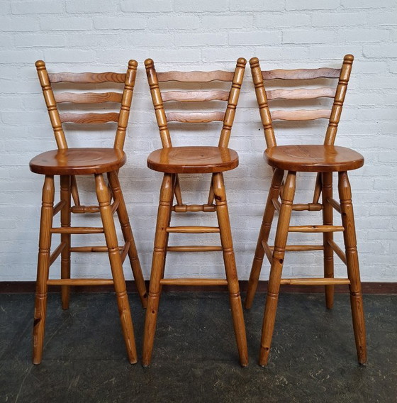 Questo set di tre sgabelli da bar in pino dal design brutalista aggiunge un tocco di fascino rustico a qualsiasi ambiente. Grazie alla loro struttura robusta e alla finitura in legno naturale, sono funzionali ed eleganti. Perfetti per un bancone da cucina o un'accogliente area salotto.