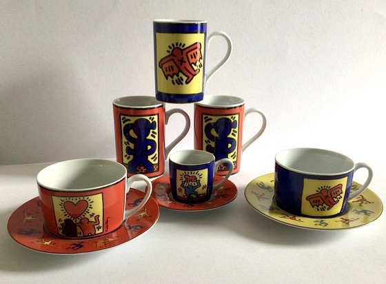 Tre tazze e piattini e tre tazze con illustrazione di Keith Haring. Prodotto da Könitz. The Estate of Keith Haring / Licenziato da MMI NYC. La firma è impressa. Anni 1980-90.