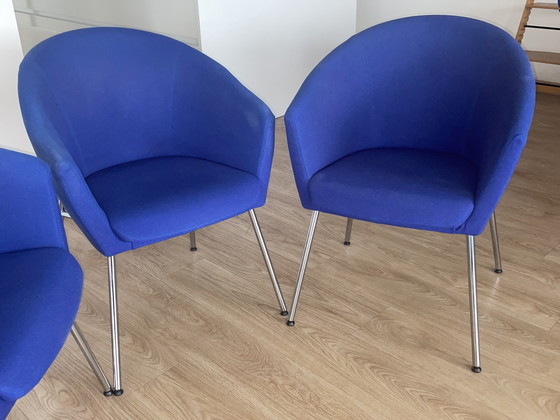 Vi presentiamo un set di tre squisite sedie Artifort Megan, disegnate dal famoso René Holten. Queste sedie sono una testimonianza di eleganza moderna, caratterizzate da un sorprendente rivestimento tessile blu che aggiunge un tocco vivace a qualsiasi ambiente interno. Le eleganti gambe in metallo forniscono una base solida, esaltando l'estetica contemporanea.