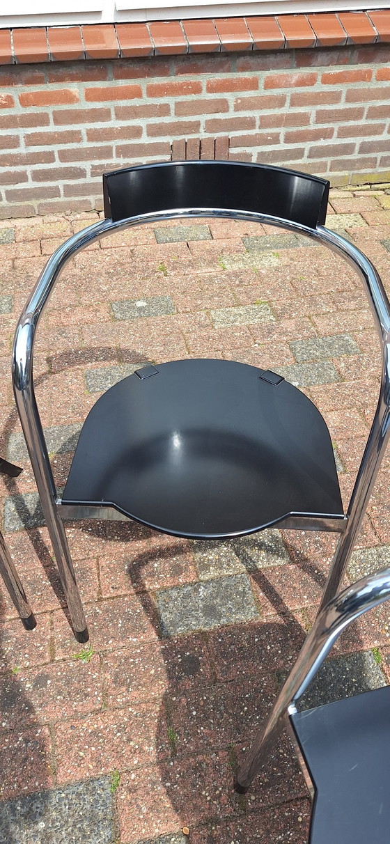 Questo set di quattro sedie da pranzo Zanotta Fauna, disegnate da David Palterer nel 1987, unisce eleganza e design moderno. Le sedie hanno una struttura tubolare cromata e una seduta in legno laccato nero. Lo schienale fluttuante aggiunge un elemento unico al design. Perfetta per un interno elegante.