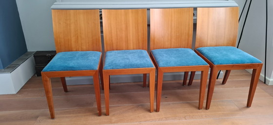 Queste sedie da pranzo sono realizzate in legno di ciliegio e le sedute sono rivestite in Alcantara blu.