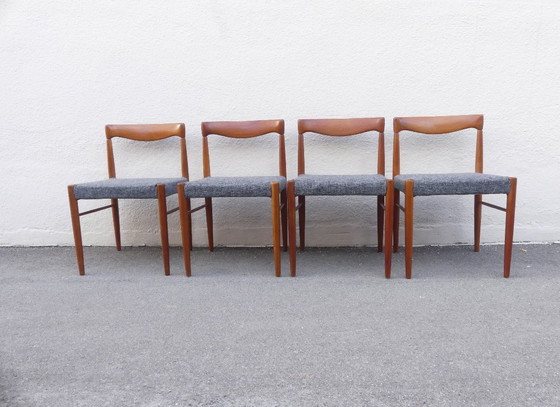 Set di quattro sedie da pranzo in teak con cuscini di seduta grigi.