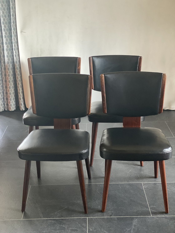 Le sedie sono realizzate in similpelle nera con schienale arcuato in laminato di palissandro e gambe affusolate. Il rivestimento dello schienale esalta la sedia e le conferisce un fascino classico. Sono molto robuste e ben fatte. Presentano segni del tempo. Sono realizzate e progettate per durare.