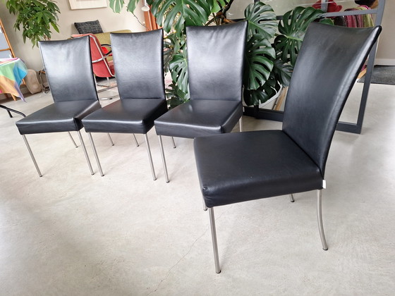 Queste sedie sono in perfette condizioni. Combinano design moderno e comfort, ideali per qualsiasi sala da pranzo contemporanea. Il rivestimento in pelle di alta qualità trasmette un senso di lusso, mentre le robuste gambe in acciaio inossidabile garantiscono stabilità e durata.
