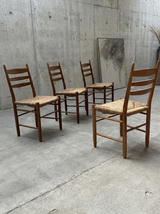 Uno splendido set di quattro sedie da pranzo realizzate in rovere massello e giunco, con schienali splendidamente affusolati e curvi.