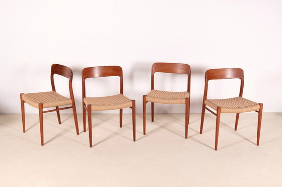 Un bellissimo set di 4 sedie da pranzo di Niels Møller, modello 75 in teak. Le sedie sono un noto classico danese del designer e produttore di mobili Niels Otto Møller. Le sedie sono in buone condizioni, con lievi segni di usura dovuti all'età. Una sedia ha una gamba anteriore restaurata (vedere le ultime 3 immagini per i dettagli di questa sedia). Questo restauro è stato effettuato circa 10 anni fa e ha resistito alla prova del tempo e dell'uso. Abbiamo anche ispezionato la struttura ed è ancora robusta e stabile, oltre che esteticamente ben fatta e professionale. Le sedie hanno un prezzo adeguato a causa di questo precedente restauro. Le sedute sono in corda di carta nuova di zecca, quindi dureranno per molti altri anni. Il legno è stato pulito e trattato. AxLxPxA: 75x50x47x44 cm.
