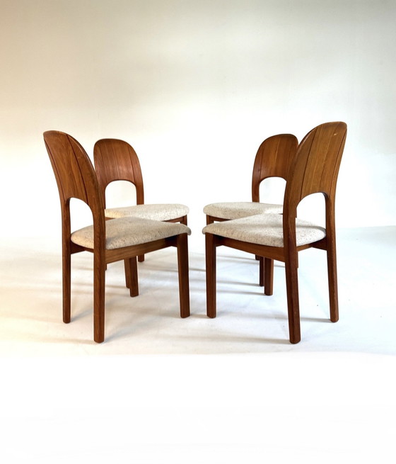 Struttura in teak massello, dalle forme armoniose e armoniose. Eleganti bordi arrotondati e splendide venature del legno a vista. Le sedie sono comode grazie all'elegante schienale alto. Le strutture sono strutturalmente solide e in condizioni solide.