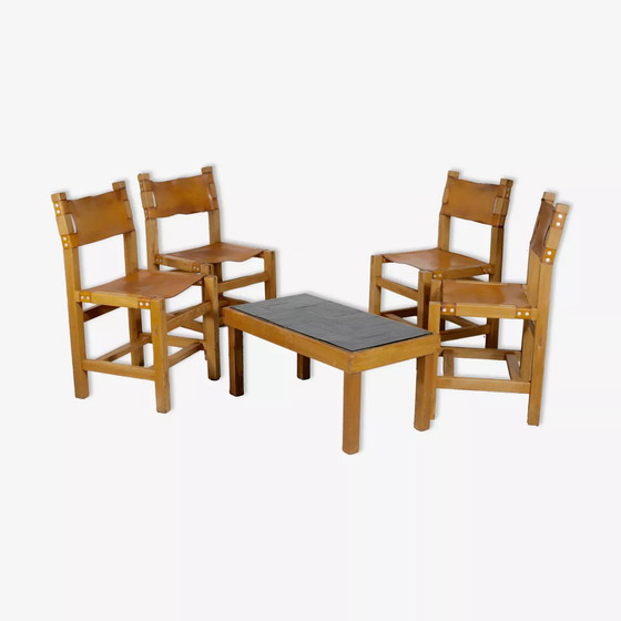 Dimensioni: H89 x L48 x P50 Colore: Marrone Materiali: Legno (materiale) Stile: Design Set di 4 sedie e tavolino Maison Regain, Francia, circa 1970. Sedie in legno e pelle. Tavolino in legno e ardesia. Usura dovuta all'età: segni sul legno, sull'ardesia, pelle patinata (vedi foto). Set in buone condizioni. Solido e stabile. Dimensioni sedia: H 89 cm, L 48 cm, P 50 cm.
