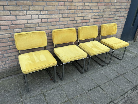 CondizioneBuonoColoriGialloMaterialeLegno, Tessile, CromoNumero di articoli4Altezza83 cmLarghezza49 cmProfondità55 cmAltezza del sedile49 cmSegni di utilizzoDecolorazione, Rughe