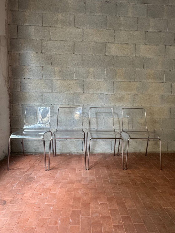 Set di 4 sedie da pranzo italiane di Calligaris, realizzate in vetro acrilico di alta qualità con un'elegante struttura in metallo. Queste sedie moderne offrono un design minimalista, perfetto per sale da pranzo contemporanee. L'acrilico trasparente conferisce un'estetica unica, permettendo loro di integrarsi perfettamente con diversi stili di arredamento. Ideali per chi desidera aggiungere un tocco di eleganza italiana alla propria casa. Alcuni segni di usura (graffi) dovuti al tempo. Vedi foto.